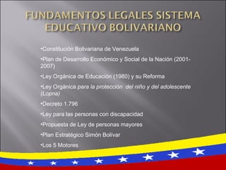 El documento resume varios artículos de la Constitución Bolivariana de Venezuela relacionados con derechos humanos, educación, cultura, pueblos indígenas y desarrollo. Establece que la educación es un derecho humano fundamental y que el Estado garantiza educación gratuita y de calidad para todos. También describe el Plan de Desarrollo Económico y Social de la Nación 2001-2007 con cinco objetivos principales: construir la democracia bolivariana, desarrollar la economía productiva, alcanzar la equidad social, o