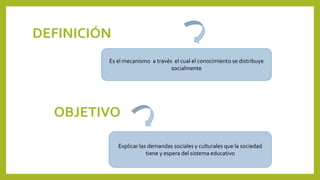 Este documento presenta una definición de currículo como el mecanismo a través del cual el conocimiento se distribuye socialmente. Explica que el objetivo del currículo es satisfacer las demandas sociales y culturales de la sociedad. También resume diferentes enfoques que han influenciado la educación superior como la expansión de ofertas curriculares y la demanda de igualdad, así como perspectivas teóricas como el funcionalismo y el conflicto.