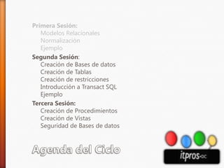 Este documento presenta una introducción a SQL. Cubre la creación de bases de datos y tablas, restricciones como llaves primarias y foráneas, y una introducción a consultas SQL básicas como SELECT y WHERE. La agenda incluye tres sesiones sobre modelos relacionales, creación de objetos de base de datos y procedimientos almacenados.