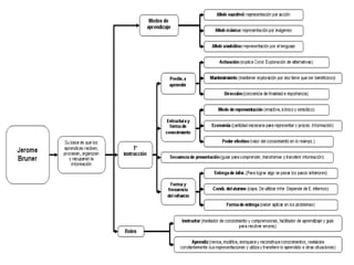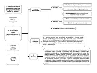 El documento presenta los fundamentos teóricos de Jerome Bruner, David Ausubel y el conectivismo. Bruner se enfoca en cómo los niños aprenden el lenguaje a través de la interacción y el andamiaje. Ausubel explica que el aprendizaje significativo depende de la estructura cognitiva previa y de relacionar nueva información de manera no arbitraria. El conectivismo considera el aprendizaje como conexión de información almacenada en dispositivos, y que el acceso a conocimiento es más importante que lo que se