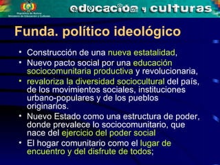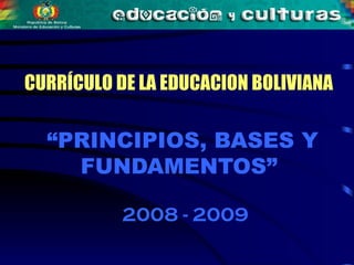 Este documento presenta los principios, bases y fundamentos del currículo educativo de Bolivia para 2008-2009. Establece que la educación debe ser sociocomunitaria, productiva y revolucionaria, valorizando la diversidad cultural del país. Define el "vivir bien" como un nuevo paradigma de desarrollo basado en la armonía con la naturaleza y la comunidad. También describe la escuela ideal como un espacio de encuentro comunitario y formación permanente al servicio de la comunidad.