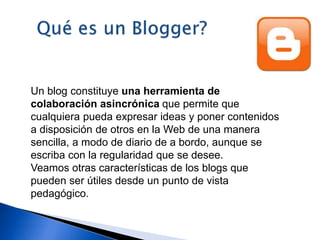 Este documento describe varias herramientas web 2.0 como blogs, wikis, foros, sitios de votación de noticias y gestores de contenido personal. Explica que un blog permite publicar noticias o artículos de forma cronológica con comentarios, y que Blogger es una plataforma popular para crear blogs. También describe a SlideShare como un sitio que permite compartir presentaciones en línea.