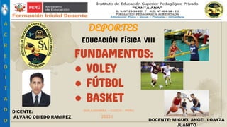 El documento resume los fundamentos básicos de tres deportes: voleibol, fútbol y baloncesto. En voleibol se describen el saque, recepción, levantamiento, ataque, bloqueo y defensa. En fútbol se detallan el control del balón, conducción, pase, recepción, dribbling y remate. Finalmente, en baloncesto se explican el bote, pase y diferentes tipos de tiros a canasta.