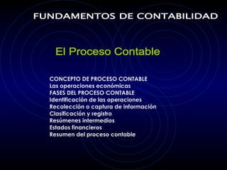 El documento describe el proceso contable, el cual consta de 5 fases: 1) identificación de operaciones, 2) recolección de información, 3) clasificación y registro, 4) resúmenes intermedios, y 5) estados financieros. El objetivo es incorporar las operaciones económicas de una organización en la contabilidad y expresarlas a través de estados financieros mediante la aplicación de la partida doble y el registro en asientos contables.
