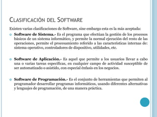 Este documento clasifica y describe los diferentes tipos de software. Explica que existen tres clasificaciones principales de software: software de sistema, software de aplicación y software de programación. Luego describe algunos ejemplos comunes dentro de cada categoría como sistemas operativos, utilidades, procesadores de texto, hojas de cálculo y bases de datos. Finalmente, discute brevemente los métodos de actualización de software y sus ventajas y desventajas.