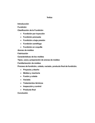 Este documento describe los diferentes procesos de fundición, incluyendo la clasificación de la fundición, arenas de moldeo, características de los moldes, y el proceso completo de fundición desde el diseño hasta el producto final. La fundición es el proceso de fabricar piezas metálicas o de plástico fundiendo un material y colocándolo en un molde para que se solidifique. Existen varios tipos de fundición como la fundición por inyección, prensada, a baja presión, y en coquilla.