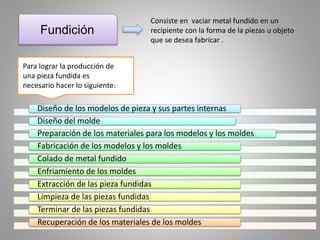El documento describe los procesos de fundición y moldeo para fabricar piezas metálicas. Explica que la fundición consiste en vaciar metal fundido en un molde con la forma de la pieza deseada. Luego detalla los principales tipos de moldes (arena, metálicos, temporales), procesos de moldeo (banco, piso, fosa) y métodos de fundición (arena, capa seca, arcilla, cámara fría/caliente). Finalmente, menciona algunos procesos especiales como la fundición a cera perdida