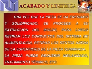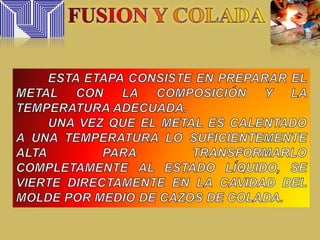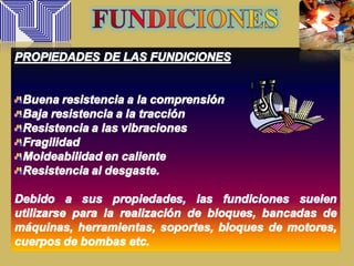 El documento describe los procesos de fundición de metales y aleaciones. Explica que la fundición implica calentar metales hasta su punto de fusión y luego verterlos en moldes para darles forma al solidificarse. También describe los diferentes tipos de moldes y arenas de fundición utilizados, así como las propiedades y aplicaciones comunes de las aleaciones ferrosas y no ferrosas obtenidas mediante fundición.