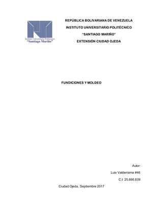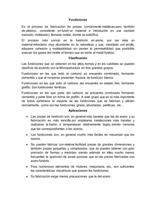 El documento habla sobre los procesos de fundición y moldeo. Explica que la fundición implica fundir un material y verterlo en un molde para solidificar la pieza. Luego clasifica los tipos de fundiciones según su microestructura y carbono. También describe las arenas de moldeo, sus tipos y preparación, así como los procesos de colada, vaciado y desmolde para obtener la pieza final.