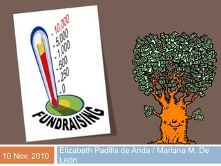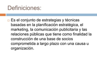 Este documento define fundraising como el conjunto de estrategias y técnicas para construir una base de socios comprometidos a largo plazo con una causa u organización mediante la recaudación de donaciones de particulares y empresas. Explica que el fundraising implica establecer objetivos y políticas, y rendir cuentas sobre el uso de los fondos recaudados. Finalmente, resume que las principales vías de fundraising son organismos públicos, empresas e individuos, y las técnicas incluyen contactos cara a cara, redes de miembros y redes sociales.