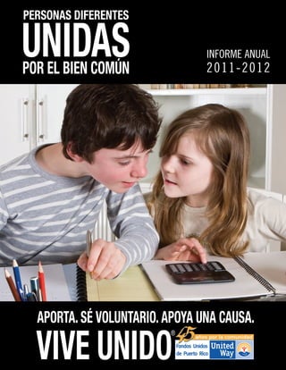 Este informe anual de 2011-2012 de Fondos Unidos de Puerto Rico describe su historia de 45 años brindando servicios a la comunidad en áreas como educación, salud y servicios familiares. El informe también describe las iniciativas actuales de Fondos Unidos enfocadas en educación de calidad, estabilidad financiera y salud, así como proyectos de colaboración, campañas de concientización, y el impacto de los más de $220 millones invertidos en la comunidad a través de organizaciones sin fines de lucro afiliadas.