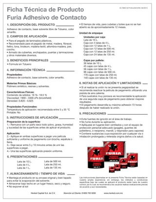 Este documento presenta la ficha técnica de un adhesivo de contacto sin tolueno llamado Furia. Proporciona pegado para laminados plásticos, metal, madera y otros materiales. Se aplica en ambas superficies a unir y se deja secar antes de presionarlas juntas. Viene en latas de diferentes tamaños y se almacena en un lugar fresco y seco para mantener su vida útil de 12 meses.
