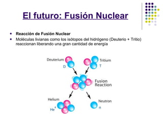 El documento describe la fusión nuclear como una fuente de energía del futuro. Explica que en la fusión nuclear, moléculas livianas como el deuterio y el tritio reaccionan liberando gran cantidad de energía. También señala que el Sol genera su energía mediante reacciones de fusión nuclear y compara la cantidad de combustible necesaria para una planta de fusión versus otras fuentes de energía como el carbón y la fisión nuclear. Finalmente, resume el proyecto ITER cuya meta es demostrar la viabilidad técnica y científica de la fus