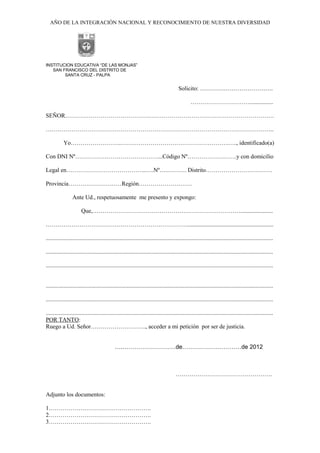El documento contiene varias solicitudes y comunicaciones relacionadas con la Institución Educativa "De Las Monjas" en Palpa, Ica. En las primeras oraciones se solicita adjuntar documentos para su evaluación. Luego, se solicita licencia sin goce de remuneraciones. Finalmente, los últimos párrafos contienen varios memorandos del director dirigidos a profesores informando la postergación de la clausura del año escolar debido a que no han presentado sus registros de evaluación.