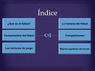 El documento resume los componentes básicos del fútbol, incluyendo una breve historia del deporte, los roles de los jugadores, las principales competiciones como la Copa Mundial y la Eurocopa, los tamaños típicos de los terrenos de juego, y algunos de los mejores jugadores del mundo como Messi, Ronaldo y otros.