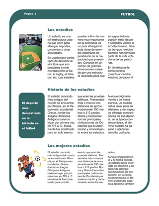 El documento proporciona información sobre la historia del fútbol, incluyendo cómo se desarrolló de un pasatiempo a un deporte global. Explica que los primeros campeonatos internacionales se llevaron a cabo en el siglo XX y que la FIFA se fundó en 1904 para organizar el deporte a nivel mundial. También describe brevemente la historia de la Copa Mundial de Fútbol y sus ediciones desde 1930.