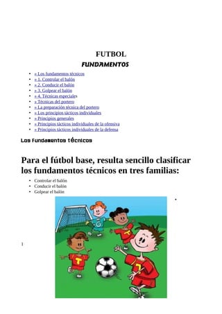 El documento describe los fundamentos técnicos del fútbol para niños, incluyendo controlar el balón, conducir el balón y golpear el balón. Controlar el balón incluye controles orientados y controles en movimiento. Conducir el balón implica progresión individual con o sin obstáculos a través de regates. Golpear el balón se refiere a pases para conservar el balón colectivamente y disparos para anotar goles.