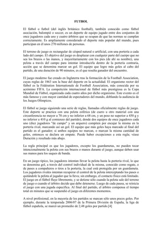 El fútbol es un deporte de equipo jugado entre dos equipos de 11 jugadores cada uno. El objetivo es marcar goles introduciendo el balón en la portería contraria, ganando el equipo que anote más goles. Se juega en un campo rectangular con porterías a cada extremo siguiendo reglas establecidas por la FIFA. Es el deporte más popular del mundo con 270 millones de personas que lo practican.
