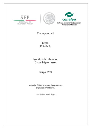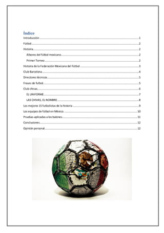 Este documento trata sobre el fútbol. Explica brevemente la historia del fútbol en México y los primeros torneos a principios del siglo XX. También describe algunos de los equipos más importantes como el Club Barcelona, el Club Deportivo Guadalajara y los directores técnicos que ha tenido la selección mexicana. Finalmente, incluye secciones sobre el uniforme y el origen del apodo "Las Chivas" para el Club Deportivo Guadalajara.