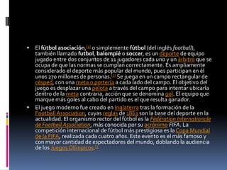 El fútbol es el deporte más popular del mundo, jugado entre dos equipos de 11 jugadores cada uno. Se juega con el objetivo de meter la pelota en la portería contraria. Las reglas modernas fueron creadas en Inglaterra en 1863. Existen diferentes posiciones tácticas como guardameta, defensa, centrocampista y delantero. Los orígenes se remontan a juegos de equipo medievales en Europa, aunque el fútbol moderno surgió en Inglaterra. El fútbol femenino ha crecido lentamente