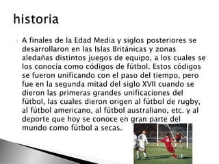 Este documento describe la evolución del fútbol desde sus orígenes en las Islas Británicas hasta convertirse en el deporte global que es hoy. Explica que en la Edad Media se jugaban distintos juegos de equipo con pelota en Europa que dieron origen a deportes como el rugby y el fútbol americano, y que el primer partido oficial de fútbol se disputó en 1872 entre Inglaterra y Escocia. En la segunda mitad del siglo XX, el fútbol creció rápidamente con la formación de organizaciones como
