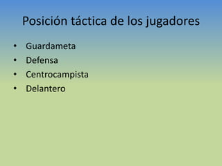 El fútbol es un deporte de equipo jugado entre dos equipos de 11 jugadores cada uno. Los jugadores se dividen tácticamente en guardameta, defensas, centrocampistas y delanteros, donde cada posición tiene objetivos específicos como evitar goles, detener ataques, coordinar el juego y marcar goles respectivamente.