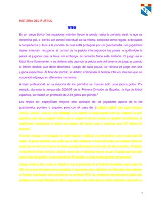 El documento describe la historia y las reglas básicas del fútbol. Explica que el fútbol se juega entre dos equipos de 11 jugadores cada uno, con el objetivo de marcar goles introduciendo la pelota en la portería contraria. También describe las diferentes posiciones de los jugadores como delanteros, defensas, centrocampistas y guardameta. Finalmente, señala que el fútbol moderno fue creado en Inglaterra en 1863 con la formación de la Asociación de Fútbol y la creación de sus