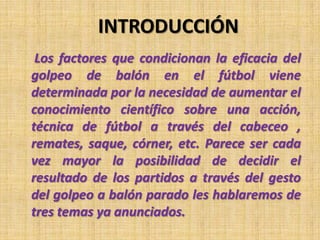 Este documento describe los músculos involucrados en diferentes técnicas de fútbol como cabeceo, remate y saque lateral. Explica los movimientos musculares necesarios para cada técnica, incluidos los músculos del brazo, hombro, espalda, cuello, piernas y pies. También analiza los pasos para realizar correctamente el cabeceo y cómo varios músculos como el trapecio ayudan con la potencia y dirección al golpear el balón con la cabeza.