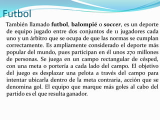 El documento describe varias variantes del fútbol como el fútbol sala, fútbol playa, fútbol para discapacitados y showball. Explica las reglas básicas de cada variante, incluyendo el número de jugadores, duración de los partidos, tamaño de la cancha y algunas diferencias con respecto al fútbol tradicional como el uso de los pies en saques de banda o la ausencia de fuera de juego. También menciona algunas de las competiciones internacionales más importantes de cada modalidad.