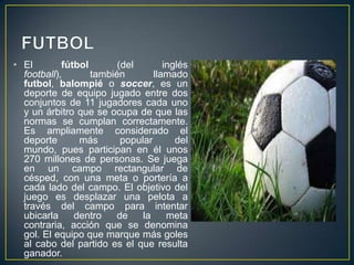 El documento resume las posiciones principales en el fútbol: guardameta, defensa, centrocampista, delantero. Explica que el guardameta es el único jugador que puede usar las manos y debe evitar goles, mientras que la defensa detiene ataques, el centrocampista crea jugadas y el delantero marca goles.