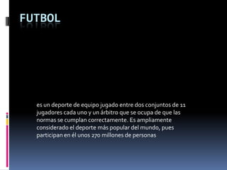 El fútbol es un deporte de equipo jugado entre dos equipos de 11 jugadores cada uno y un árbitro, considerado el deporte más popular del mundo con 270 millones de personas jugando. Tiene sus orígenes a mediados del siglo XIX pero se formalizó en 1863 con la fundación de la Asociación de Fútbol en Inglaterra para estandarizar las reglas.