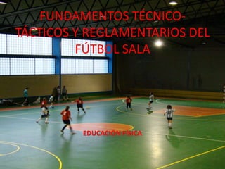 Este documento presenta los fundamentos técnico-tácticos y reglamentarios del fútbol sala. Explica la historia del deporte, las características del juego, los fundamentos técnico-tácticos de ataque y defensa, los fundamentos táctico-estratégicos, y las reglas básicas.
