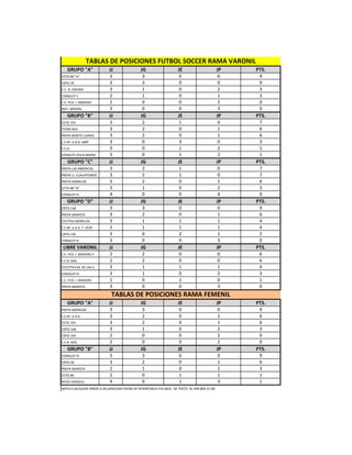 Este documento presenta el calendario y reglamento de los Juegos Deportivos Estatales Conadems 2013 de fútbol soccer en Aguascalientes. Incluye las fechas, horarios y sedes de los partidos de los grupos varoniles A, B, C y D, así como los grupos femeniles A y B. También presenta tablas con los resultados y posiciones de los equipos participantes hasta el momento.