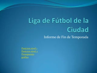El informe resume las posiciones y resultados de 4 equipos de nivel 1 y 4 equipos de nivel 2 en la temporada reciente. También incluye un resumen presupuestario que muestra los ingresos planificados frente a los reales, los gastos planificados frente a los reales, y un excedente presupuestario planificado frente al real. Finalmente presenta un gráfico que compara el presupuesto planificado con el gasto actual.