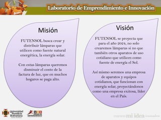 FUTENSOL busca crear lámparas solares y otros aparatos que funcionen con energía solar para 2024 con el fin de reducir los costos de energía eléctrica de los hogares y convertirse en una empresa líder en este sector en el país. Las lámparas solares capturan la energía del sol durante el día y la almacenan para usarla por la noche sin emitir contaminantes.