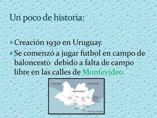 El fútbol de salón surgió en 1930 en Uruguay cuando se comenzó a jugar al fútbol en canchas de baloncesto debido a la falta de espacio en las calles de Montevideo. Es un deporte de contacto físico que se juega entre dos equipos de 5 jugadores cada uno en una cancha rectangular de 40 por 19 metros. Cada tiempo dura 20 minutos y solo se pueden cometer 5 faltas por jugador antes de ser reemplazado.