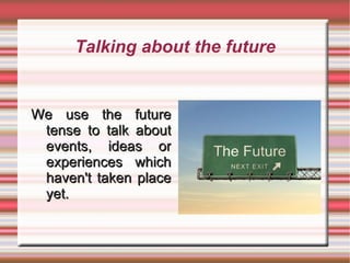 The document explains how to use the future tense in English, focusing on the constructions with 'will' and 'going to'. It outlines the grammatical structure for affirmative, negative, and interrogative forms for both expressions, along with their different uses, such as expressing voluntary actions, promises, plans, and predictions. The document concludes by emphasizing the importance of these forms in discussing future events.