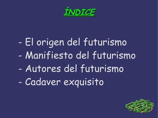 El documento resume el origen y principios del movimiento artístico futurista en Italia a comienzos del siglo XX. El futurismo surgió en Milán y fue definido por Filippo Tommaso Marinetti en su Manifiesto Futurista de 1909. Algunos autores futuristas importantes fueron Umberto Boccioni, Luigi Russolo y Giacomo Balla. El documento también explica el juego del cadáver exquisito creado por los surrealistas, que involucra la creación colaborativa y azarosa de obras.