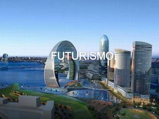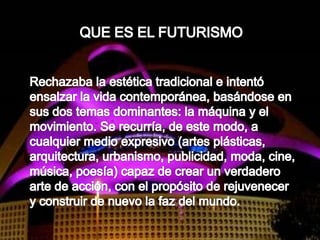El futurismo rechazaba la estética tradicional y ensalzaba la vida contemporánea basándose en la máquina y el movimiento. Se caracterizaba por exaltar la originalidad, estructuras de movimiento, y contenido relacionado con el mundo moderno y la tecnología. Utilizaba colores resplandecientes, transparencias, y multiplicación de líneas y detalles para generar la impresión de dinamismo. Fue fundado por Filippo Tommaso Marinetti en 1909 en Italia.