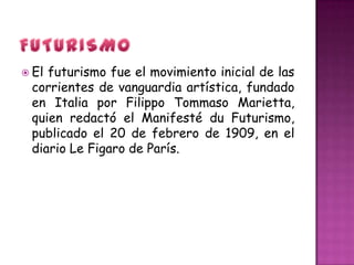 El futurismo fue un movimiento artístico fundado en Italia en 1909 por el poeta Filippo Tommaso Marinetti, que buscaba romper con la tradición y glorificar la velocidad, la tecnología y la violencia de la época moderna. Se caracterizó por intentar representar el movimiento a través de formas geométricas y colores puros, y por rechazar el pasado y los museos. Influenció a otros movimientos como el cubismo y el constructivismo.