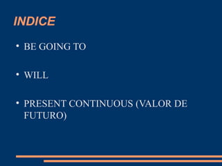 Este documento explica las diferencias entre tres formas de expresar el futuro en inglés: be going to, will, y present continuous. Be going to se usa para predicciones basadas en evidencia o planes ya pensados. Will se usa para predicciones generales y decisiones tomadas en el momento. Present continuous se usa para planes cercanos en el futuro que están en la agenda.