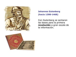 El documento describe cómo la revolución de la imprenta de Gutenberg sentó las bases para la primera gran revolución de la información. Más tarde, la llegada de Internet marcó una nueva revolución al digitalizar y globalizar el mundo. Esta revolución está ligada al corazón mismo de la educación a través de la adquisición, organización y transmisión de información usando recursos como el correo electrónico. La educación ya no puede concebirse sin las nuevas tecnologías y se potencia a través de la interactividad, la sindicalización de conten