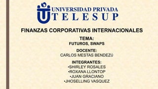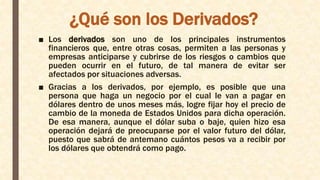 El documento presenta información sobre derivados financieros como futuros y swaps. Explica que los futuros son contratos estándar para comprar o vender activos en el futuro a un precio predeterminado, y que los swaps involucran el intercambio periódico de flujos de efectivo entre dos partes. También describe los tipos principales de swaps, como los swaps de tasas de interés y divisas, y sus usos para mitigar riesgos financieros.
