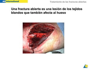 Este documento describe el tratamiento de las fracturas abiertas. Incluye una evaluación inicial de la lesión, desbridamiento quirúrgico, estabilización de la fractura, irrigación de la herida, y opciones para el cierre de los tejidos blandos. El objetivo del tratamiento es preservar los tejidos viables, prevenir infecciones, lograr consolidación ósea, y recuperar la función.