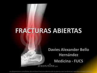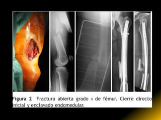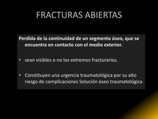 Las fracturas abiertas son fracturas óseas en las que los extremos fracturados están en contacto con el exterior, lo que aumenta el riesgo de infección. Existen varias clasificaciones, como la de Gustilo-Anderson, que categoriza las fracturas abiertas en tres tipos dependiendo de la gravedad de la herida y lesión de los tejidos blandos asociados. El tratamiento debe centrarse en prevenir infecciones, lograr consolidación ósea y recuperar la función del área afectada.