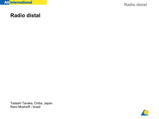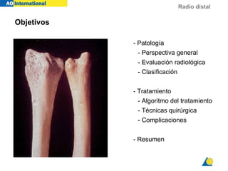 1. El documento describe la patología, evaluación radiológica, clasificación y tratamiento de las fracturas del radio distal. 2. Se presenta un algoritmo de tratamiento que incluye técnicas quirúrgicas como fijación externa, agujas K, placas y tornillos, e injertos óseos. 3. La reducción anatómica a través de procedimientos quirúrgicos apropiados es crucial para el pronóstico, especialmente en fracturas intra-articulares.