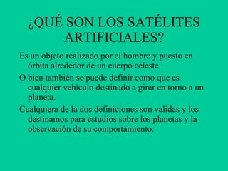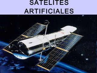 Los satélites artificiales son objetos creados por el hombre y puestos en órbita alrededor de un cuerpo celeste como la Tierra. El primer satélite artificial, el Sputnik 1, fue lanzado por la Unión Soviética en 1957. Existen varios tipos de satélites, incluyendo satélites meteorológicos, de comunicaciones y militares. Los satélites artificiales contienen varias partes como la carga útil y el sistema de propulsión.