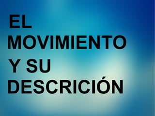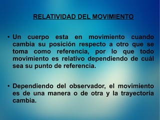 Este documento describe los conceptos básicos del movimiento, incluyendo que todo movimiento es relativo dependiendo del punto de referencia, las magnitudes como posición, tiempo, velocidad y aceleración que se usan para describir un movimiento, y las diferencias entre movimiento uniforme y variado. También explica cómo se representa la velocidad mediante vectores y clasifica los tipos de movimiento.