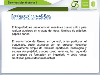 Este documento describe la evolución de las máquinas troqueladoras, desde las manuales hasta las automáticas modernas controladas por computadora. Explica que originalmente el troquelado se realizaba de forma manual con bajas velocidades y alto desperdicio. Luego surgieron las troqueladoras mecánicas accionadas por prensas, e hidráulicas con mayores fuerzas de corte. Finalmente, los avances en electrónica e informática permitieron automatizar el proceso y controlar las troqueladoras a distancia desde una computadora.