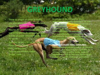 El documento proporciona información sobre varias razas de perros, incluyendo sus orígenes, características físicas, temperamento y cuidados requeridos. Describe razas como el galgo afgano, gran danés, golden retriever, gordon setter y greyhound, resaltando sus habilidades para la caza, carreras o como mascotas familiares.